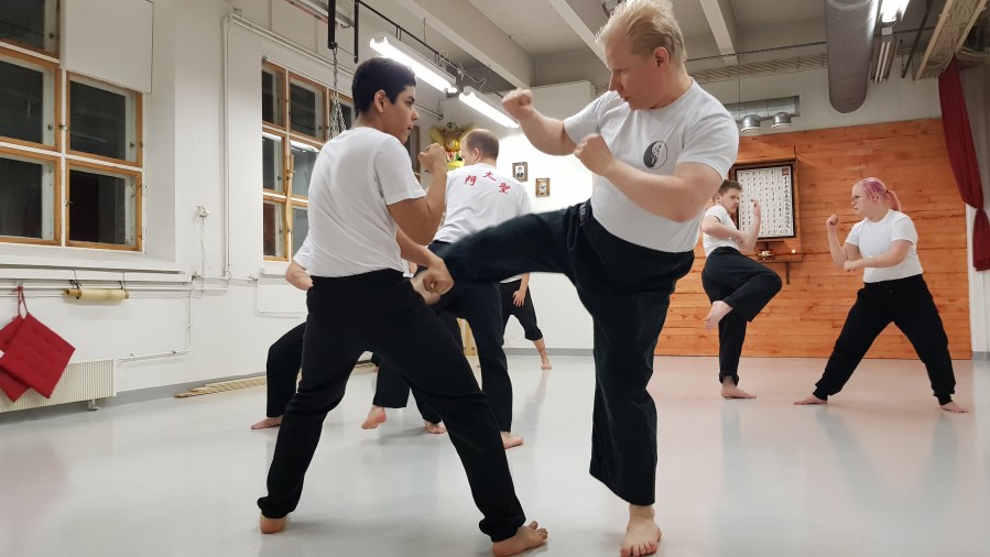 Nuorten ryhmässä harjoitellaan ensin kehonhallintaa, tasapainoa, kamppailuharjoittelun perusteita ja tutustutaan kungfu-koulun perinteisiin.